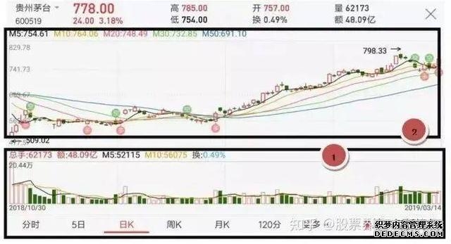 成交量:绿色柱状线表示股票收阴时每日或每周的成交量;红色柱状线表示股票收阳时的成交量。